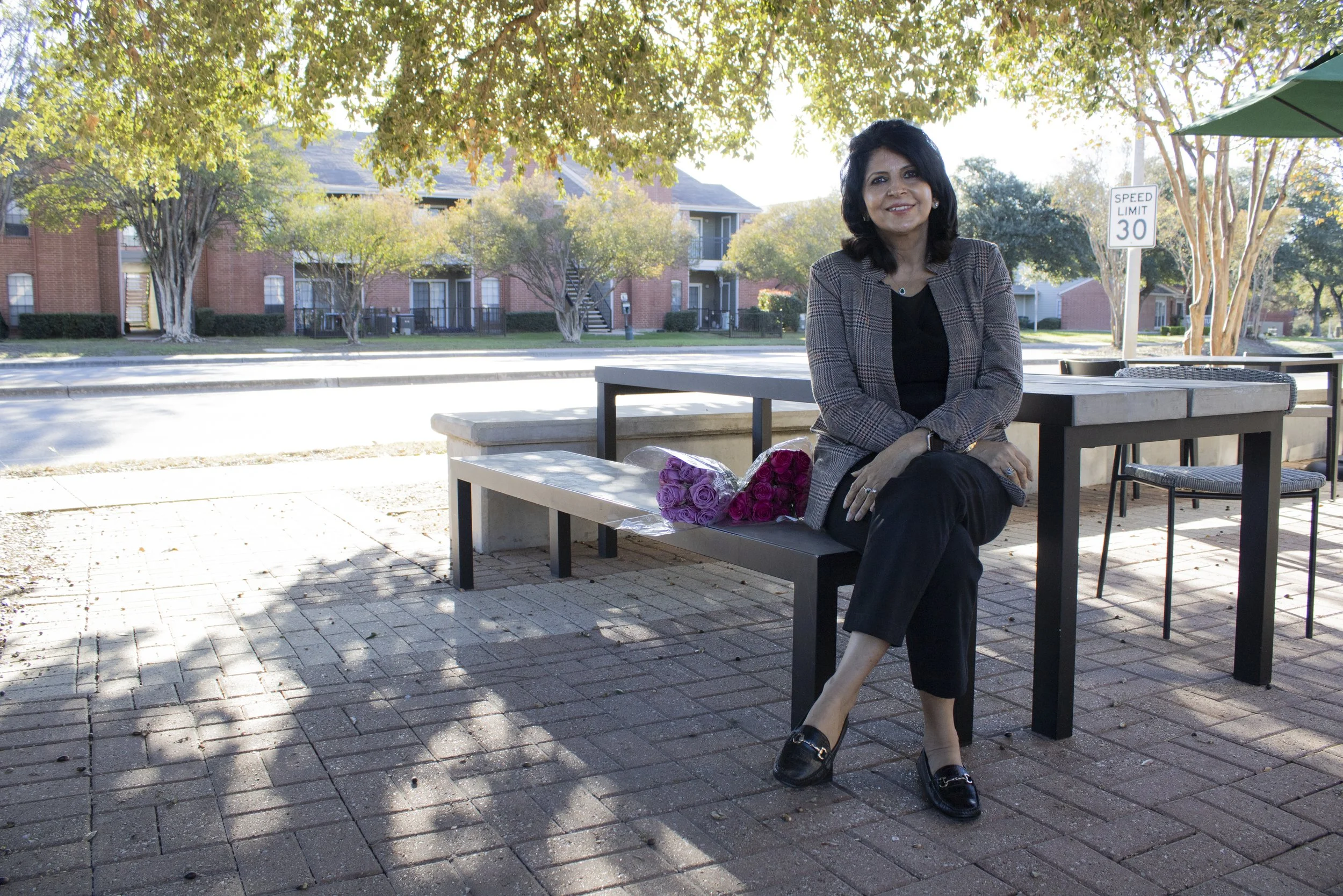 November 2025- Seema Govil, founder of Flowers for Joy, poses with a bouquet of flowers. Keep Austin Fed donates surplus flowers to Flowers for Joy every Monday.